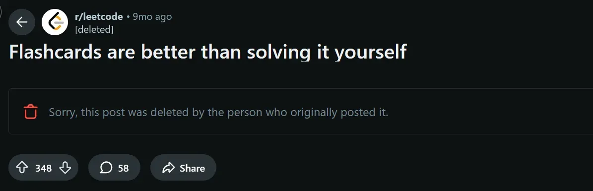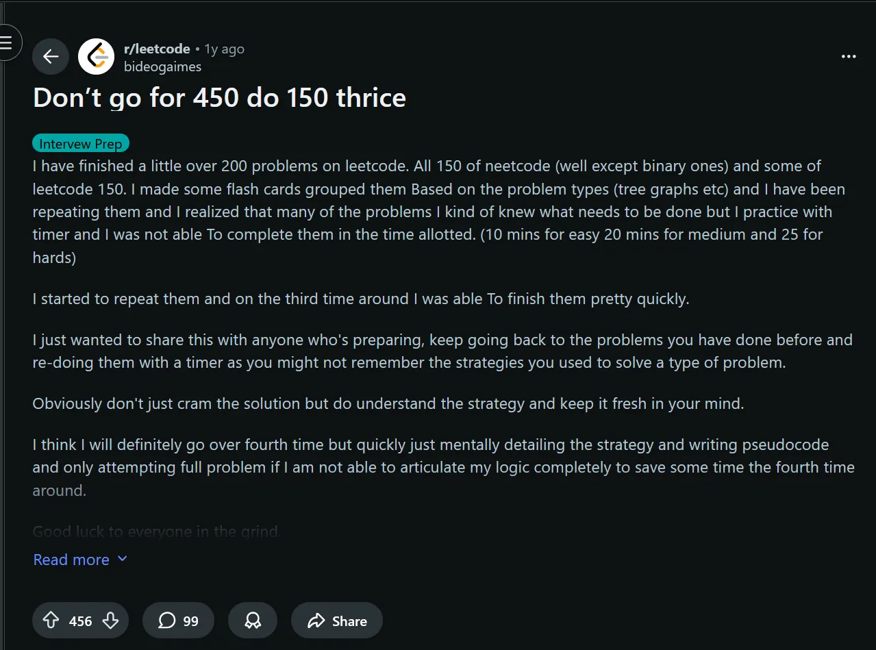 In the broader problem solving community, no one tells you to “redo the same 150 problems until you memorize them.” That would be insane. But somehow in the Leetcode space, this is normalized and even encouraged.